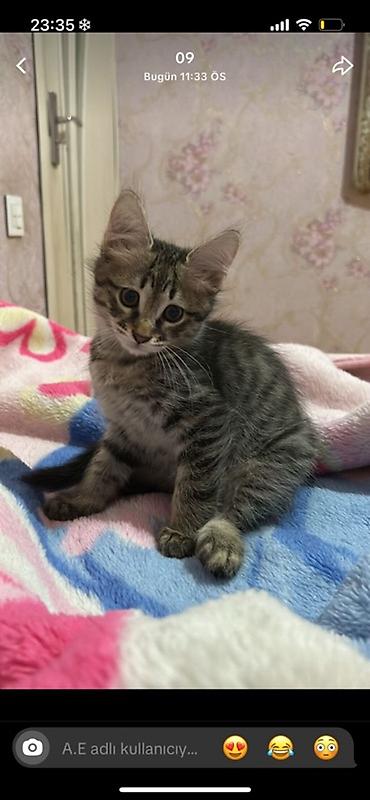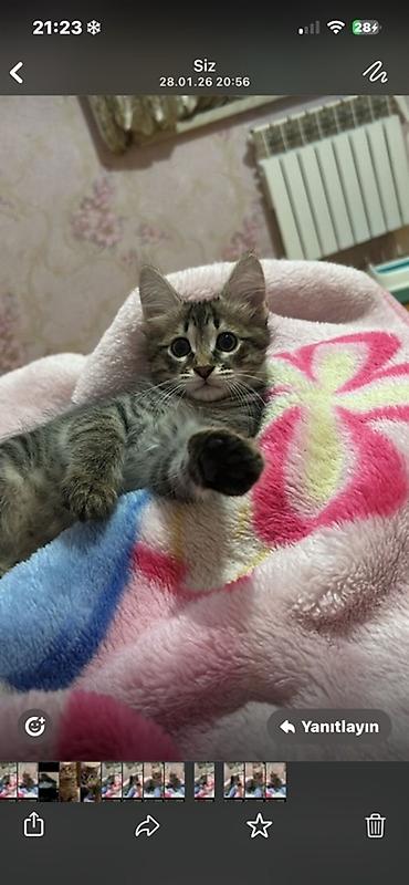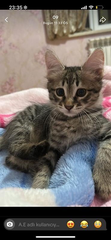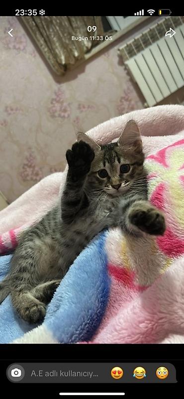 Gözəl boz rəngli balaca pişik balası - Rəng: boz, tünd və açıq zolaqlı, sinə və pəncələrdə ağ ləkələr - Gözlər: iri və ifadəli - Quşqun qulaqlar, qısa yumşaq tüklü quyruq - Çox oynaq və maraqlıdır...
