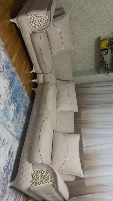 Ölçü təxmini: 3 oturacaqlı düz formaya yaxın, geniş künc hissə effekti verən uzun konstruksiya. Yastıqlar çıxarılandır. Rəng palitrası: bej/nude və kərpic-narıncı aksentlər.