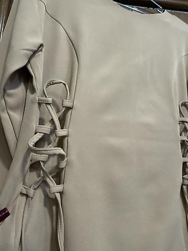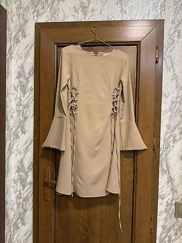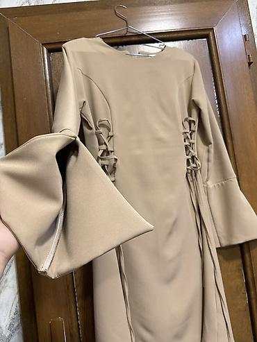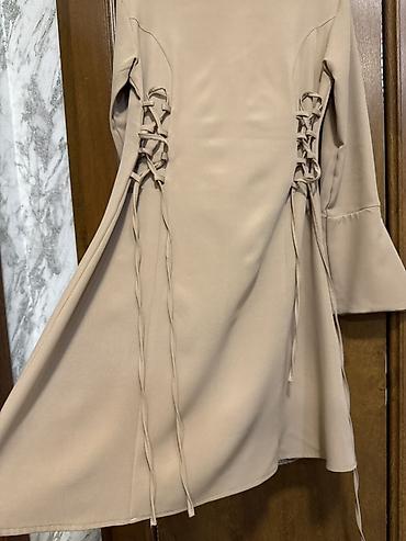 Zərif qadın paltarı – bej rəngdə, dizə yaxın uzunluq. - Model: A-kəsim, beldən yüngülcə açılan ətək. - Üst hissə: asimmetrik volanlı qollar və sinə hissəsində dekorativ qatlanmalar. - Yaxa: dairəvi...