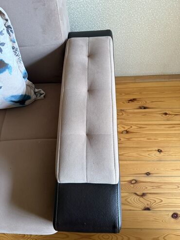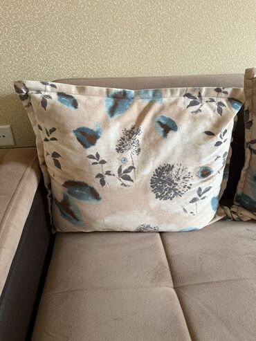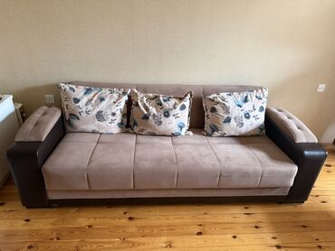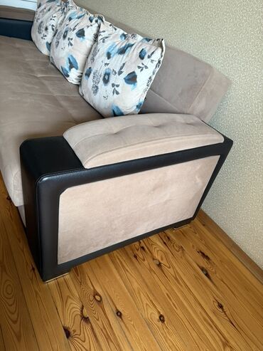 Bej rəngdə, yumşaq süet toxumalı üçlü divan. Küncləri və alt hissəsi tünd (eko‑dəri görünüşlü) detallar ilə vurğulanıb, geniş və rahat oturacaq blokları var. Hər iki tərəfdə yastı, quilt tikişli qoltuqaltılar yerləşir. Komplektə çiçək və yarpaq naxışlı, mavi-bej tonlarında 3 iri söykəncə yastığı daxildir. Divanın alt hissəsi möhkəm baza ilə tamamlanıb, metal dayaq ayaqları var. Rahat oturma və dincəlmə üçün ideal, müasir və klassik interyerlərlə asan uyğunlaşır. Rəng palitrası: bej, qara, mavi-acıq tonları. Ölçülər təxmini: uzunluq təqribən 2.2–2.3 m, oturacaq dərinliyi geniş. Yataq funksiyası var.Qiymet razilasma yolu ile.