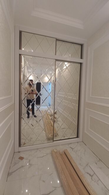 Gömme dolab – otaqdan tavana qədər, çox bölməli - Dizayn: krem rəngli parlaq fasadlar, uzun qızılı tutacaqlar, taxta teksturalı iç hissə. Tavanadək ölçüləndirilib, yuxarı hissədə ayrıca antrisol ş...