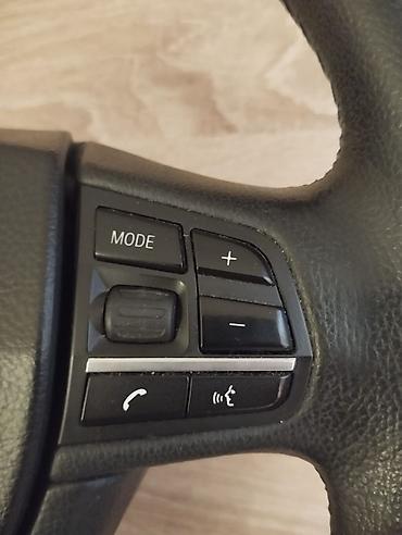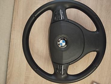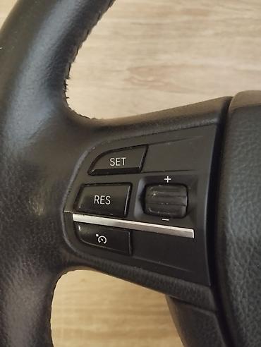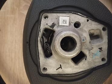 - Sükan: orijinal BMW dəri sükan. Üzerində çoxfunksiyalı idarəetmə düymələri var: səs/mahnı idarəsi (+/– rull), kruiz-kontrol üçün SET/RES və aktivləşdirmə düyməsi. Mərkəz hissəsində orijinal emblemlə. Arxa hissənin şəkillərində şlifsiz şarnir və elektrik konnektoru görünür. Yastıq (airbag) komplektə daxil deyil.
