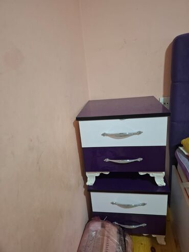 - 2 ədəd tumba: 3 çəkməcəli, dekorativ ayaqlı, bənövşəyi-ağ fasad, metal tutacaqlar