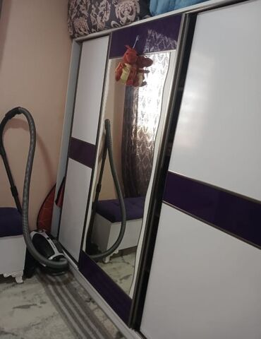 - Geniş sürgülü qapılı şkaf: güzgülü ön panel, bənövşəyi dekor zolaqları