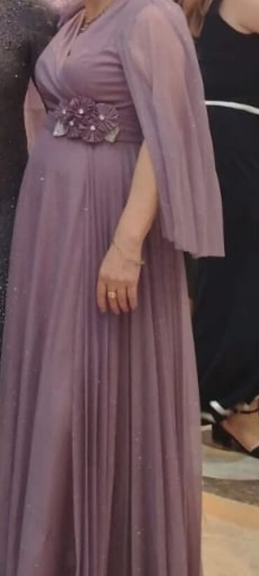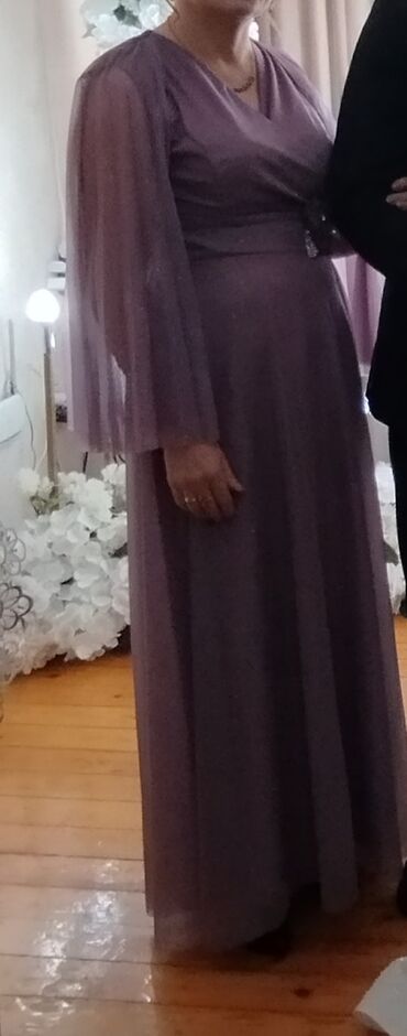 Mauve rəngdə zərif ziyafət donu - Ölçü: 40 (şəkildə qeyd olunub) - Üst hissə krujeva örtüklü, dekorativ mirvari və daş detalı - Qısaqol, yumru yaxa - Bel hissəsində incə bəzək lentli - Aş...