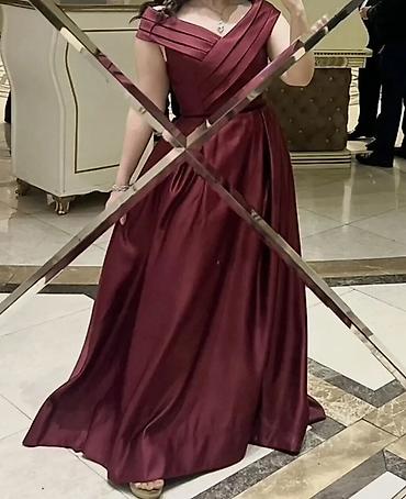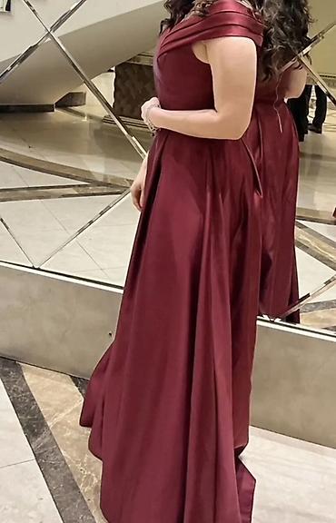 Bordo rəngdə zərif ziyafət/nişan geyimi. - Parıltılı atlas tipli parça - Uzun, axıcı ətək; asimmetrik kəsim effektli laylar - Qısa “puf” qol detayı - Ön hissədə krujeva-bağlama (korsaj görünüşlü),...