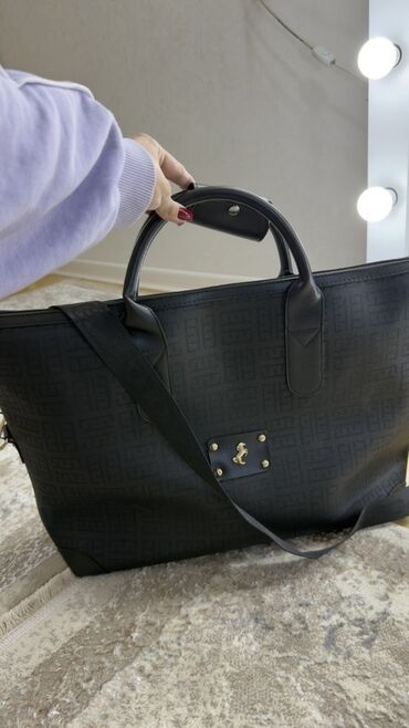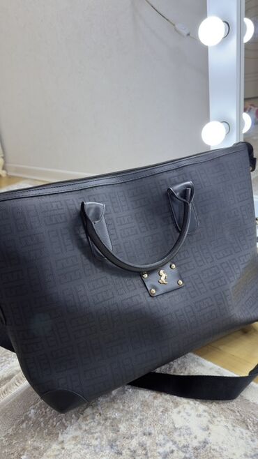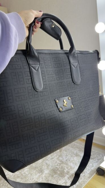 - Rəng: qara, mat teksturalı səth, üstündə klassik naxışlı monoqram print