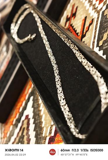 - Zəncir növü: sıx və simmetrik “bizans”/“kral” tipli hörgü – hər halqa bir-birinə keçmiş mürəkkəb naxışla formalaşıb