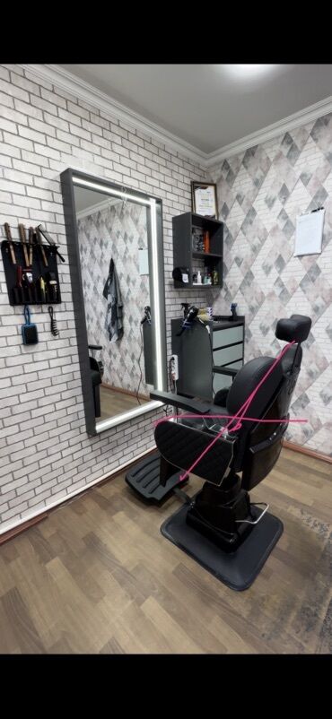 Barber/xairdressinq üçün hazır iş küncü: kreslo, LED güzgü, alətlik və çekmecəli şkaf birlikdə göstərildiyi kimidir. Dizayn – qrafit/qaranlıq tonlarda, salon interyeri ilə uyğun.