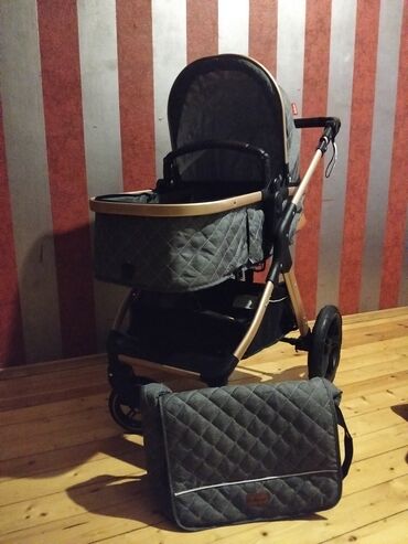 Uşaq arabası – çoxfunksiyalı beşik tipli model - Rəng: tünd boz, qızılı çərçivə ilə - Konstruksiya: yüngül və dayanıqlı alüminium gövdə - Beşik bölməsi: tam düz yatır, yumşaq içlik və ayaqörtüyü i...