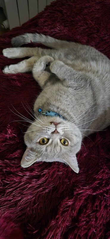 Boz rəngli çox gözəl balaca pişik balası. Xüsusiyyətlər: - Yumşaq, tükü sıx və vahid boz rəngdə - Böyük, ifadəli gözlər - Boynunda zınqırovlu yaxalıq - Sakit və mehriban temperament; qucağı, yatma...