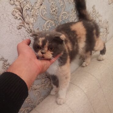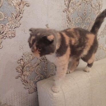 Skottiş Fold balası – qıvrıq qulaqlı, qısa tüklü, boz-krem rəng çalarlarında zolaqlı naxışlı. Yumşaq, sıx tüklü kürk, iri yuvarlaq gözlər, qısa burun və kompakt bədən quruluşu. Fotoşəkillərdə qırmı...
