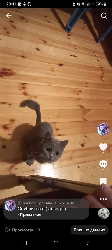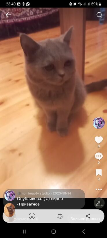 Britaniya qısatüklü (British Shorthair tipli) boz rəngli pişik - Rəng: bərk-boz (blue/grey), tük örtüyü sıx və yumşaq - Qulaqlar: kiçik və yığcam, baş quruluşu yumru - Gözlər: iri, ifadəli - Bədən...