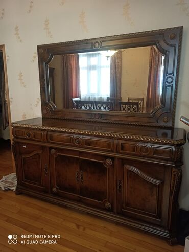 Klassik üslubda böyük bufet və güzgü komplekti - Material: masif ağac karkas, dekorativ oyma detallar, qabartmalı bordürlər - Rəng: isti qoz/şabalıd tonları, panellərdə naxışlı finiş - Üst hissə: ...