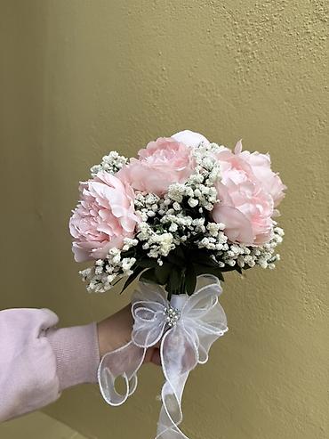 - Tərkib: iri açıq çəhrayı pionlar və xırda ağ gipsofila (baby’s breath), yaşıl yarpaqlar.