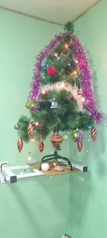 - Bəzəklər komplekti: müxtəlif ölçülü və formalı şarlar (yaşıl‑bənövşəyi, qırmızı‑qızılı, ağ və s.), qırmızı-qızılı spiral oyuncaqlar, çan formalı və digər dekorlar