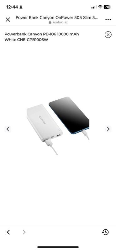 Qutuda göstərilən model: Powerbank Canyon PB-106 10000 mAh White CNE-CPB1006W. Mobil cihazları gün ərzində etibarlı şəkildə şarj etmək üçün rahat həll.