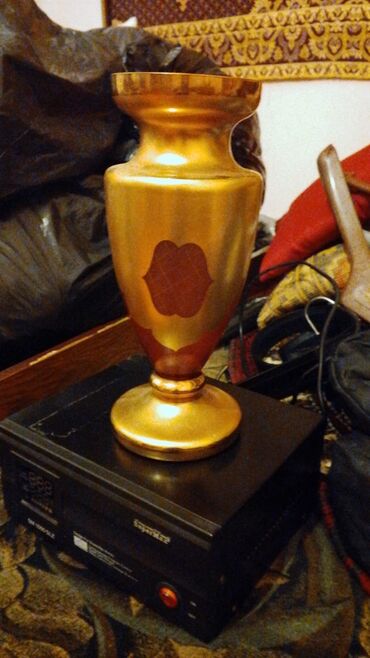 - Dekorativ vaza: Qızılı rəngli, parlaq səthli, ayaqlı klassik formadadır. Gövdəsində qırmızı tonlarda ornamental medalyon detayı var. Masaüstü, konsol və ya vitrin üçün dekor kimi nəzərdə tutulur.