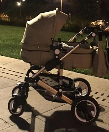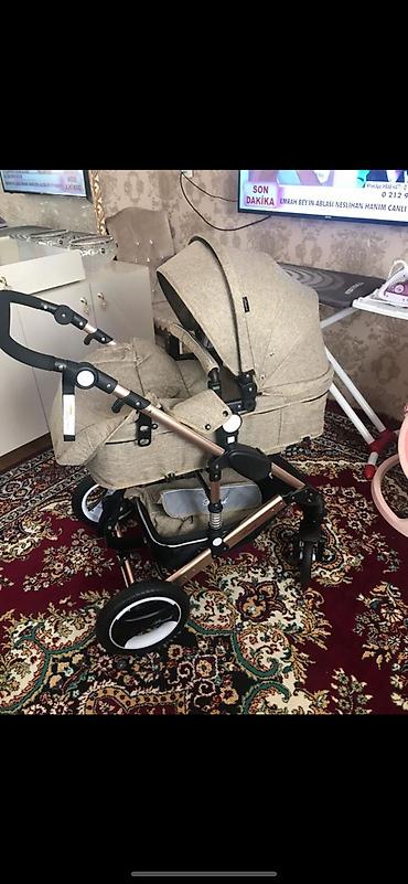 Körpə arabası – bej rəng, möhkəm alüminium şassi ilə.