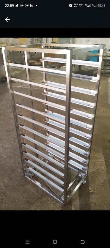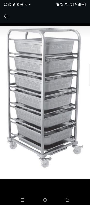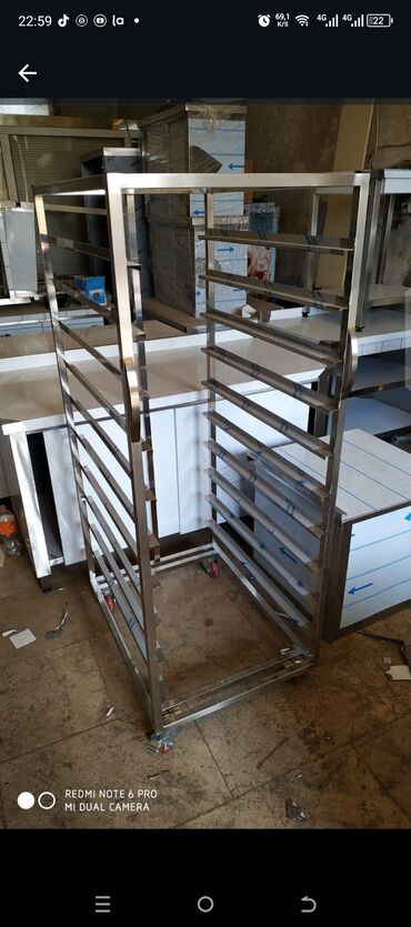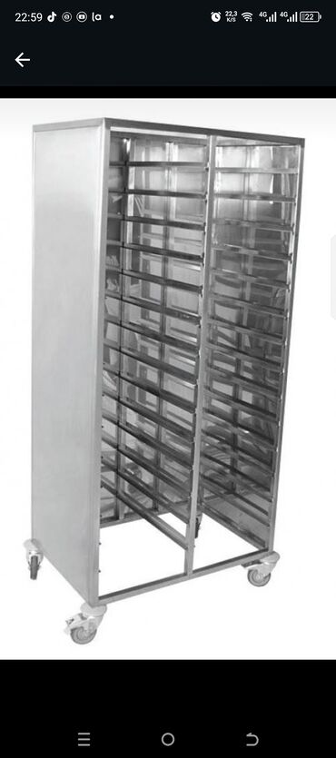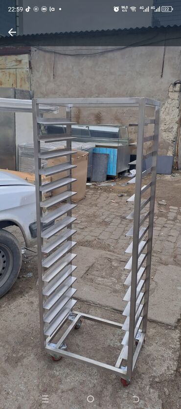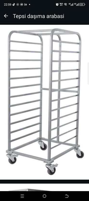 Ödənişli çatdırılmaPaslanmayan metaldan hazırlanmış, təkərləri olan, çoxsaylı rəfləri olan çörək arabası. Çörək və ya digər məhsulları saxlamaq və daşımaq üçün idealdır. Restoranlar, kafelər və ya qida istehsalı müəssisələri üçün əlverişlidir.