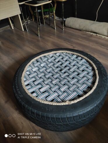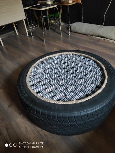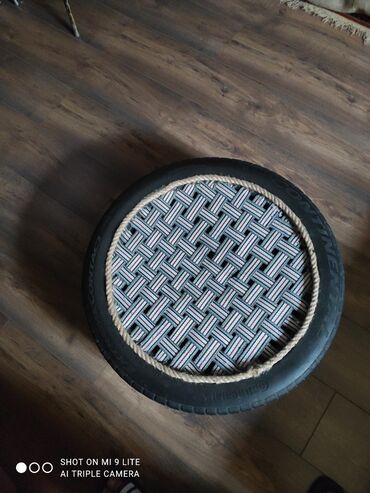 Yumuşaq pouf/stul dəsti - Model: 2 ədəd pouf – biri kvadrat formalı, digəri silindrik. - Material: Parça/kumaş üzlü, yumşaq doldurucu ilə. Silindrik modelin oturacaq hissəsi naxışlı parça ilə örtü...