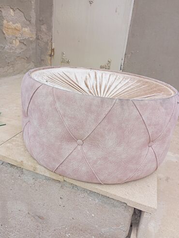 Pudra-çəhrayı rəngdə, velvet/parça üzlüklü, kapitone düyməli dekorla işlənmiş oval yumşaq usaq besiyi isdeyen olsa elqe nom yaza biler