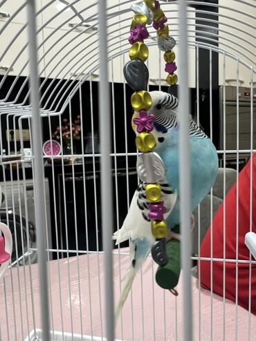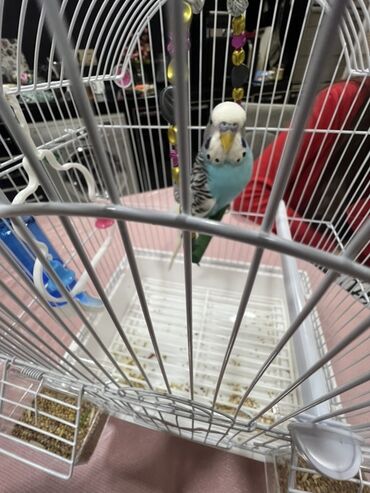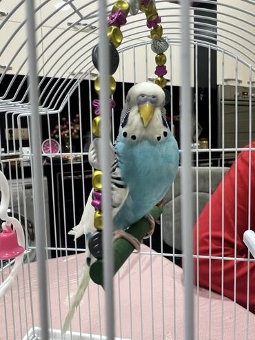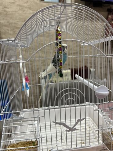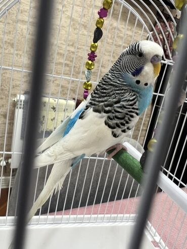 Məhsul: Dalmatian naxışlı, mavi-ağ rəng çalarında dalğalı papuqay (budaq quşu) və aksesuarlarla birlikdə qəfəs komplekti.