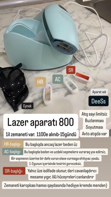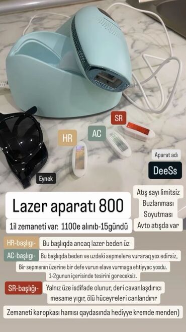 Mətn üzərindəki məlumat: 1 il zəmanət; 1100‑ə alınıb, 15 günlük. Zəmanətli, karopkası tam, hədiyyə krem qeyd olunub. Lazer aparatı 800.