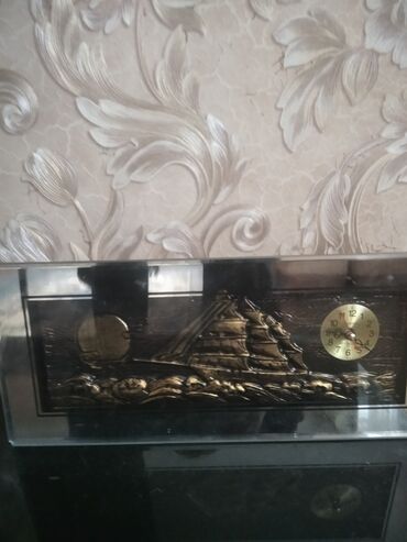 4) Masaüstü dekorativ saat – şüşə vitrin korpusunda relyef metal panel: dəniz dalğaları fonunda yelkənli gəmi və günəş təsviri, sağ tərəfdə klassik siferblat. İnteryer üçün kolleksiya üslublu dekor.