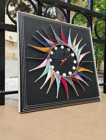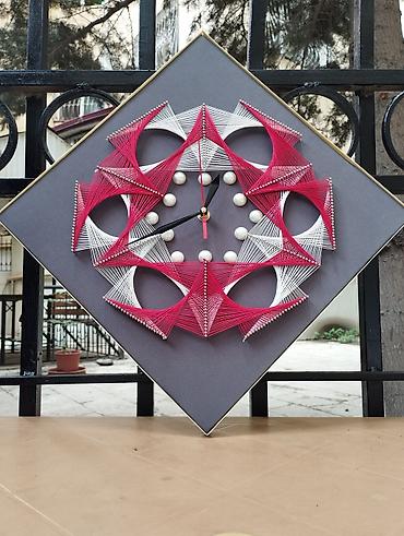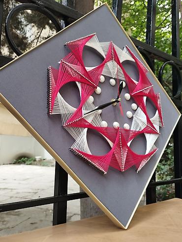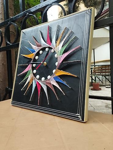 - Əl işi dekorativ divar saatı. Kompozisiya taxta əsas üzərində quraşdırılmışdır; rəngli ipliklər xırda mıxlar üzərində gərilərək həndəsi naxışlar yaradır.