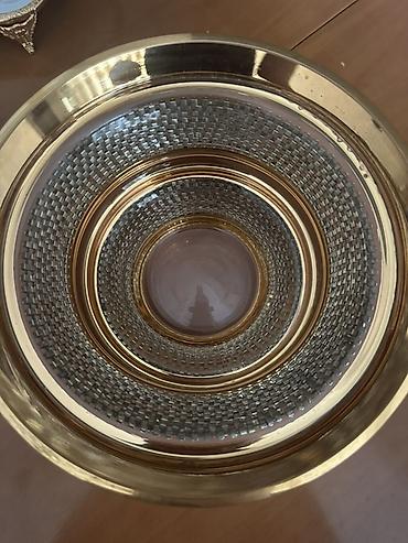 - Material: qalın şüşə/gəc şüşə, kənar və halqalarda qızılı tonlu örtük