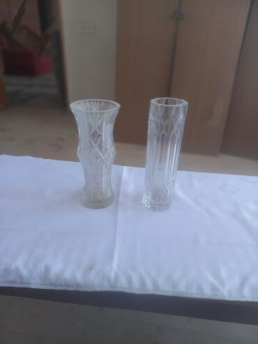 - 2 ədəd şəffaf şüşə vaza – dərin kəsimli, geometrik naxışlı; biri silindrik, digəri dalğalı konturlu