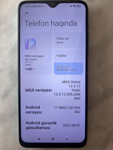 Android 11 əməliyyat sistemi və MIUI Global 12.5.12 interfeysi ilə təchiz edilmiş Redmi Not ,