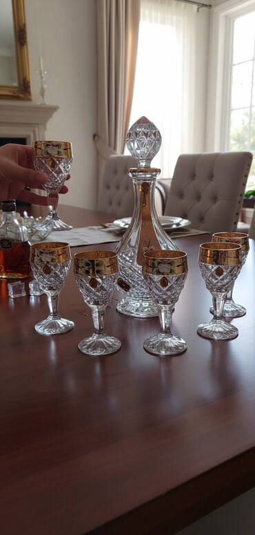 İçki qabı 12 rumkası ilə birgə. Rus xrustalıdır. Yeni, istifadə edilməyib