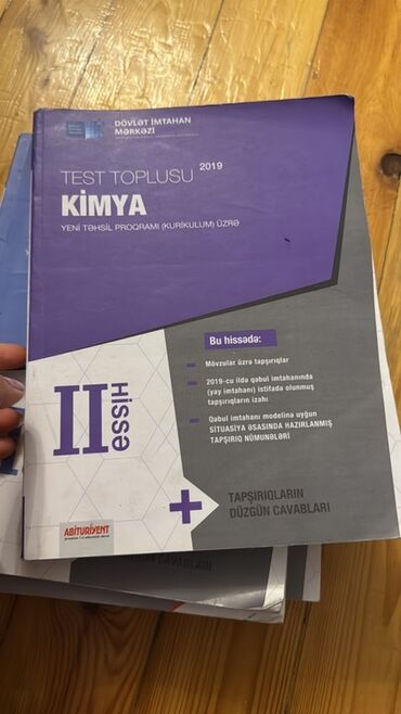 - Test Toplusu: Kimya, II hissə (2019) – Kurikulum üzrə. Mövzular üzrə tapşırıqlar, 2019-cu il qəbul imtahanında istifadə olunmuş tapşırıqların izahı, qəbul imtahanı modelinə uyğun situasiya əsaslı tapşırıq nümunələri, tapşırıqların düzgün cavabları.