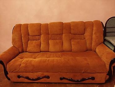 divan - Klassik, düz xətli dizayn: Hündür bel hissə, enli qol dayaqları, dekorativ tikişlərlə bölünmüş oturacaq və arxa hissə. - Material: Yumşaq toxumalı parça (müxtəlif rənglər – boz, göy, qəh...