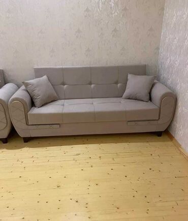Mebel növü: 3 nəfərlik divan - Model: Düz xəttli, geniş oturacaqlı, kvadrat tikişli bel hissəsi - Rənglər: Tünd boz və iki rəngli (krem + qəhvəyi) variantlar - Parça: Yumşaq toxumalı üzlük, asan t...