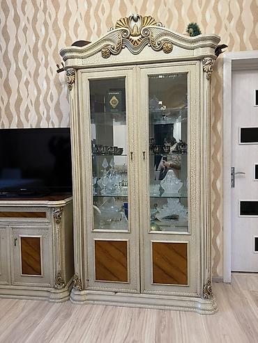 Qonaq otağı üçün mebel dəsti Tərkib: - 2 ədəd vitrin şkafı: şüşə qapılı, 3 şüşə rəfli, aşağı hissədə biri ikili qapı, digəri 2 iri siyirmə ilə. Üst kənarlarda qızılı dekor elementləri, ön tərəfdə ...
