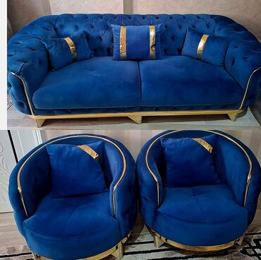 - Komplekt: böyük divan, iki ədəd rahat kreslo, uyğun tumba və iki dekor yastıq