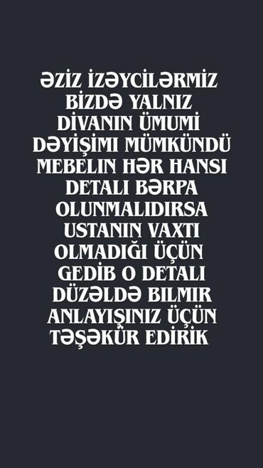 Mebellərin təmiri və sifarişi kime usda lazim olsa serik yer goturub islemey olar ve ya kim normal mais verse onunla da razilasib isleyerem sifirdan divani ozum yigiram - Künc divanlar, yumşaq meb...