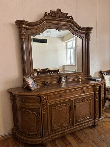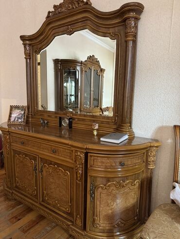 Klassik üslubda qonaq otağı üçün dəst – güzgülü konsol və şkaf - Material: ağac əsaslı massiv konstruksiya, təbii ağac teksturası və intarsiya naxışları - Üslub: klassik/barokko elementləri, oyma ...