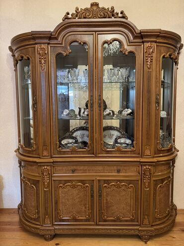 Klassik üslubda massiv taxtadan hazırlanmış mebel dəsti Tərkibi: - Geniş vitrin şkafı: dörd şüşə qapı, içəridə şüşə rəflər, aşağıda dekorativ çekmece. Krujevalı oyma detallar və üst hissədə orname...