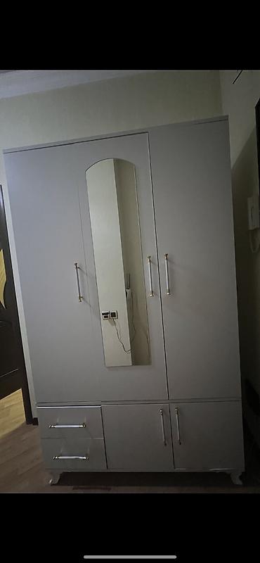 3 qapılı, güzgülü paltar şkafı - Ölçü: Hündürlük 200 sm, en 120 sm - Daxili quruluş: asılqan bölməsi, 3 çekmece, yandan 4 açıq rəf - Ön hissədə tam boy güzgü - Rahat tutacaqlar, modern minimal diz...