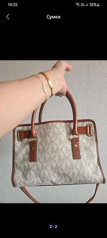 Michael Kors xanım çantası 1 dəfə istifadə oıunub - Rəng: krem/ağ fon üzərində bej “MK” monoqramlı naxış - Material: möhkəm örtüklü ekokürk/deri tipli material (səth teksturalı) - Furnitura: qızılı...