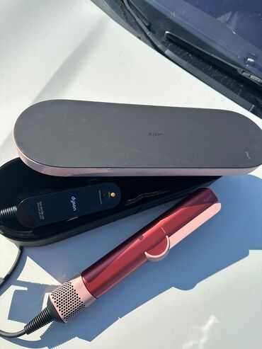 Dyson saç ütüsü – xüsusi məhdud buraxılış rəngdə (qırmızı/çəhrayı). Komplekt: maqnitli sərt etui və şarj/enerji bazası olan kabel bloku.