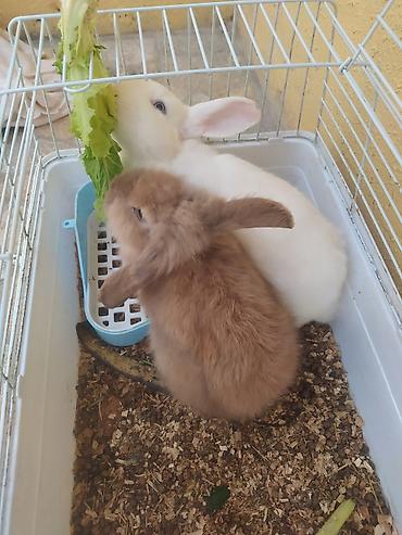 - İki ev dovşanı: biri ağ, digəri açıq qəhvəyi rəngdə, asma qulaqlı (lop tipli görünüşdə). Yumşaq tüklü, sakit xasiyyətli, yarpaq tərəvəzləri (salat və s.) məmnuniyyətlə yeyirlər.