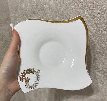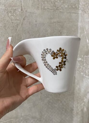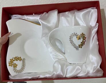 Porselen fincan dəsti - Klassik ağ rəngdə, gümüşü/boz çiçək naxışları ilə - 6 ədəd fincan - 6 ədəd kvadrat formalı boşqab (altlıq) - 1 ədəd südlük/kiçik qrafın - Ürək formalı qutuda yığılmış kompl...