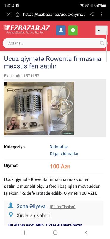 Rowenta saç feni.hem çölə hem içeri burur saçı. turkiyeden cox baha alınıb istifade olunmur deye satilır