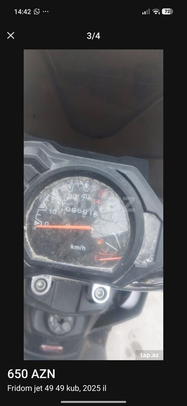 Freedom Jet 49 skuter - Rəng: qırmızı/qara - Kuzovda “Freedom” və “Jet49” yazıları - Sürətölçən analoq panel, yanacaq göstəricisi - Odometr: təxminən 17300 km - Mühərrik: 49 cc (etiketdə “Jet49”),...