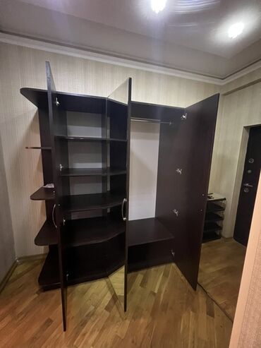 - Sağ bölmə: paltar asmaq üçün metal asılqan borusu və aşağıda geniş polka/oturacaq hissə